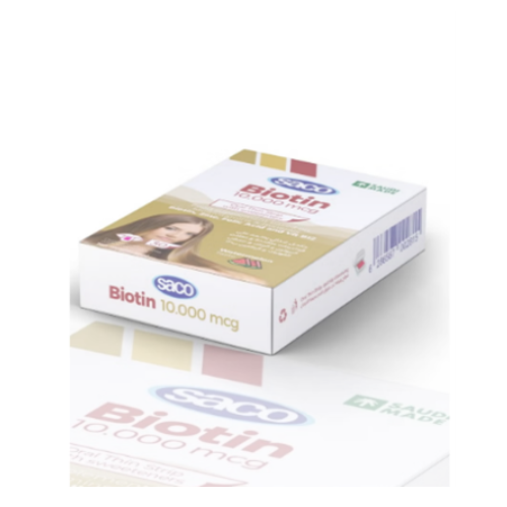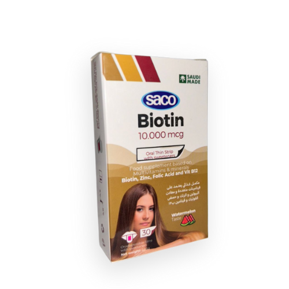 - ساكو فيتامين بيوتين هو مكمل غذائي متكامل يحتوي على البيوتين بجرعة 10000 مكغ، إلى جانب فيتامينات متعددة ومعادن مثل الزنك، حمض الفوليك، وفيتامين ب12. تأتي الشرائح بنكهة البطيخ اللذيذة، مما يجعلها طريقة سهلة وممتعة للحصول على الفيتامينات الضرورية. البيوتين معروف بفوائده في دعم صحة الشعر، الأظافر، والبشرة، خاصة للأشخاص الذين يعانون من نقص البيوتين أو تساقط الشعر